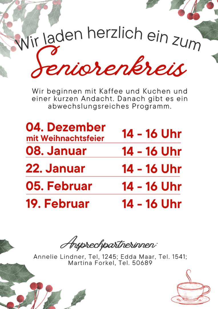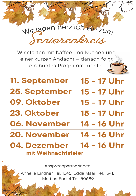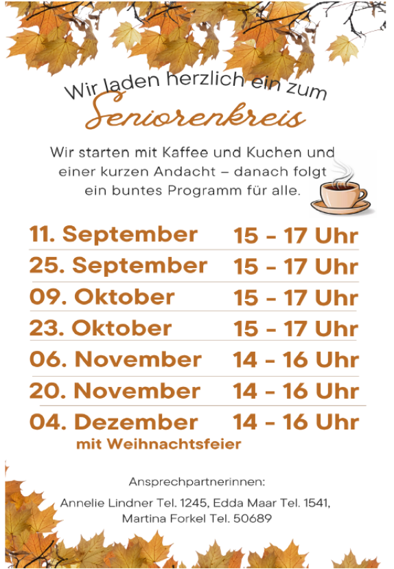 Der Seniorenkreis hat seit über 20 Jahren seinen festen Platz im Mönchrödener Gemeindeleben. Herzliche Einladung an alle, die Zeit haben und sich gerne in geselliger Runde treffen. Das Alter spielt keine Rolle!